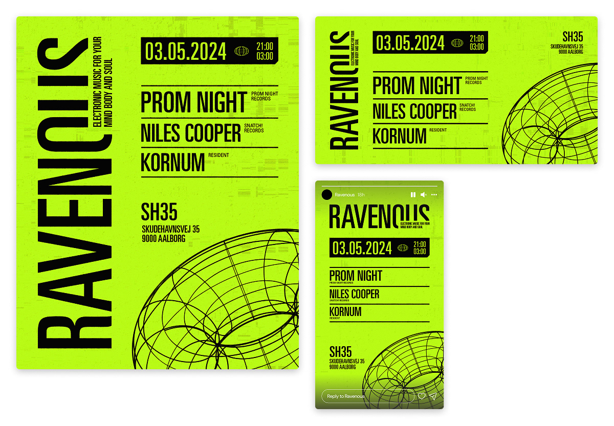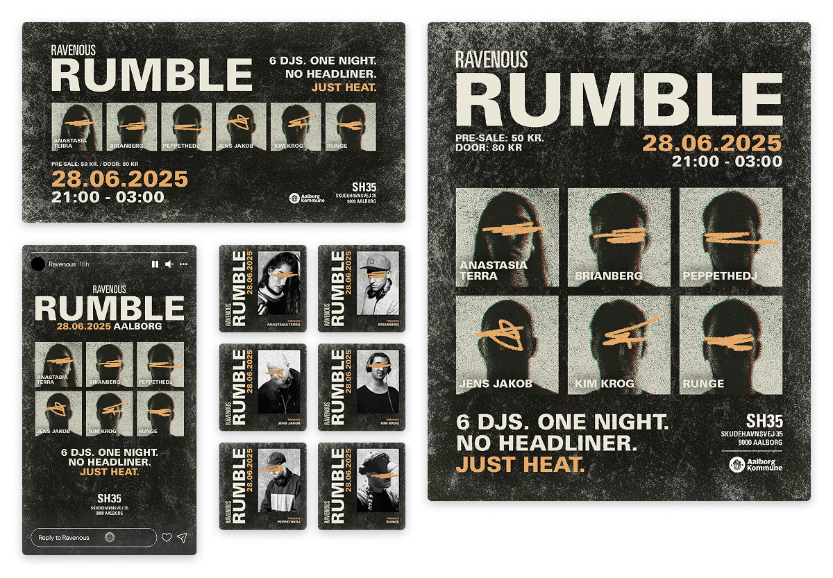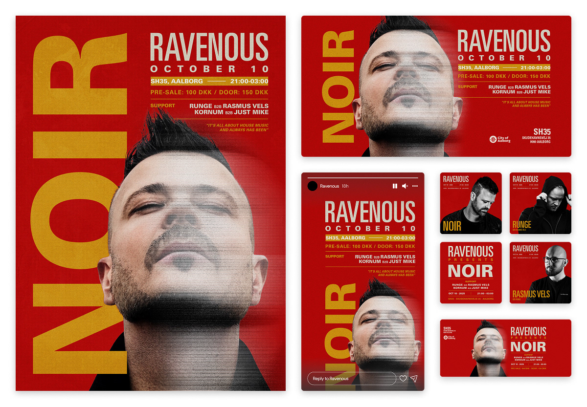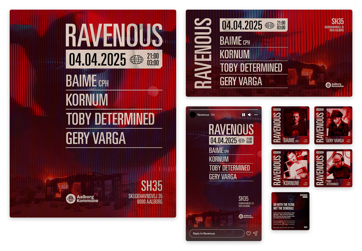 Ravenous is a series of club events in Aalborg, Denmark, dedicated to electronic music and underground culture. The organizers wanted a bold and distinctive visual identity that could capture the raw energy of the dance floor and stand out across both digital and physical platforms.